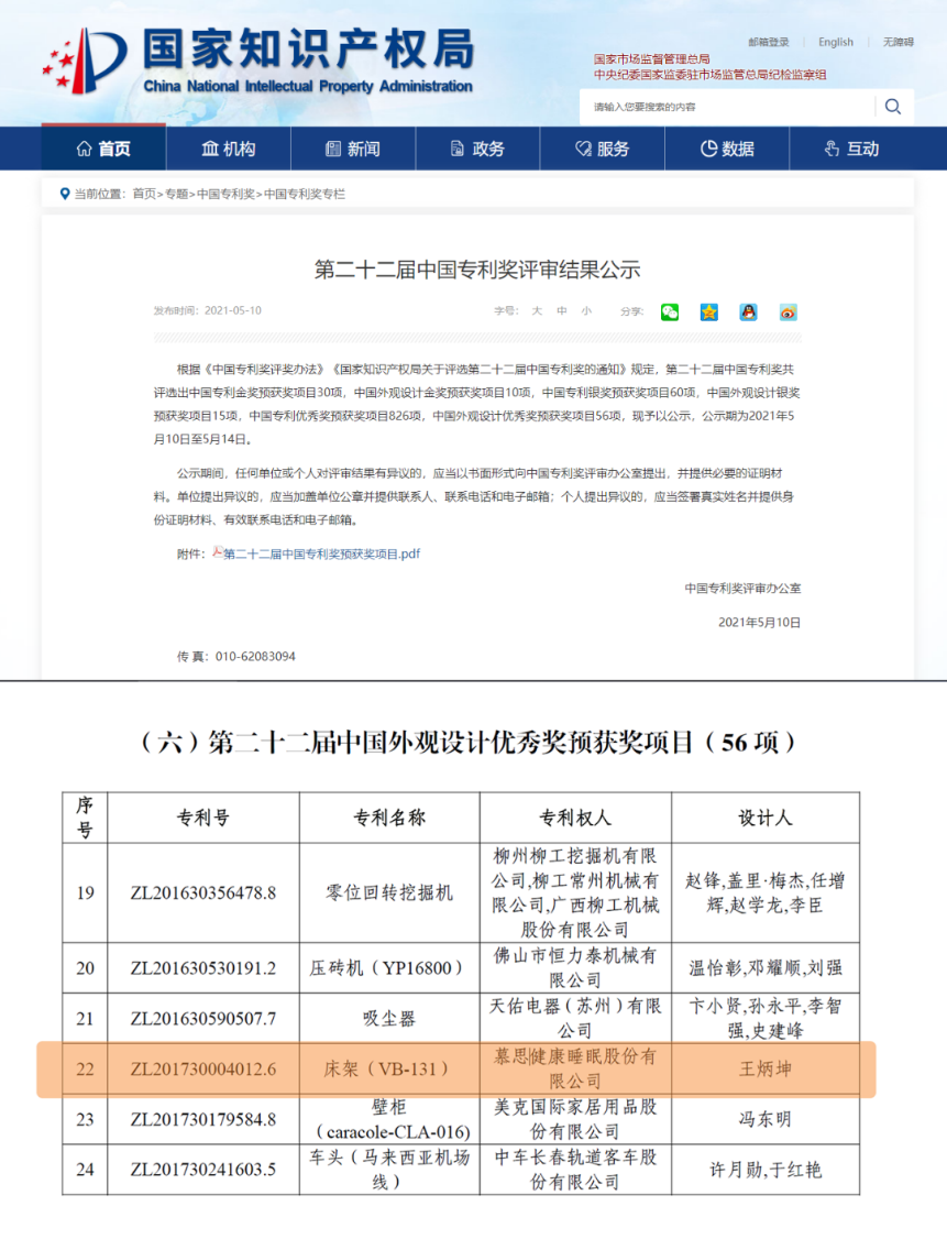 慕思集团首获国家级专利奖项——中国外观设计优秀奖
